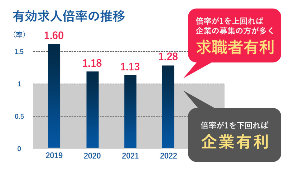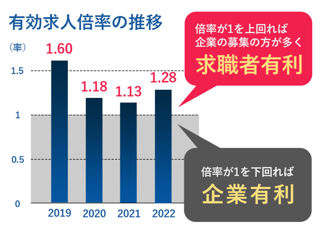 応募が思うように集まらない理由には、求人に対する応募者数の増加が挙げられます。近年は、ネットを通じて簡単に求人情報が手に入るため、多くの人が応募に苦戦。その為、同じポジションに対しての応募者数が増え、有効倍率が高まっています。この状況を踏まえ、求人票の内容や募集手法に改善を加えることが必要不可欠です。